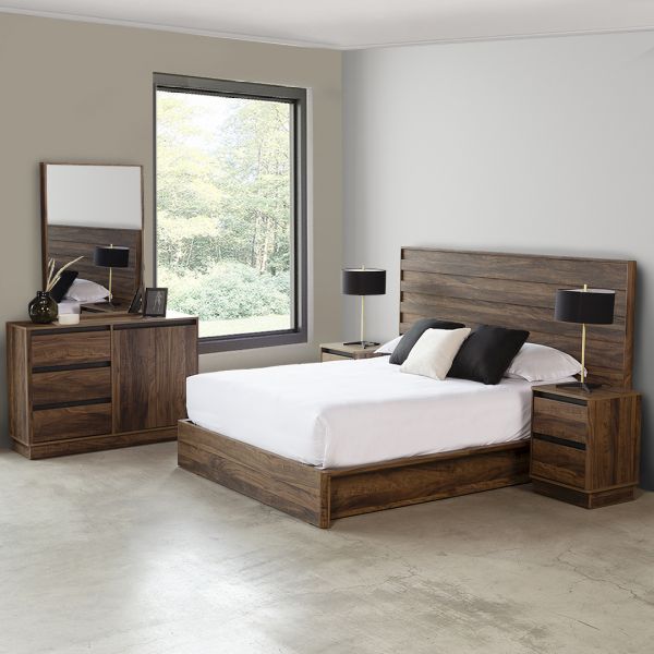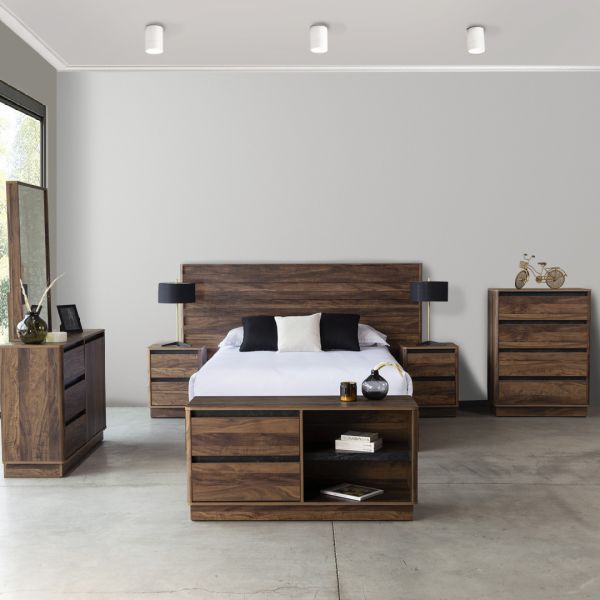 Fabricada en resistente MDF y madera industrializada, la Recámara Britania cuenta con un acabado en foil de alta calidad color nogal, que ofrece una apariencia cálida y elegante, ideal para crear un ambiente acogedor y con estilo.
