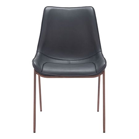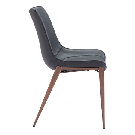 Esta silla sin brazos y con su silueta sencilla puede dar un toque especial a tu comedor o mantener un ambiente informal. Un diseño bellamente bordado en imitación cuero negro presta atención a los detalles. Lo suficientemente cómodo como para usarlo como silla de escritorio. Las patas de sintoniza marrón mate cuentan con patas protectoras de plástico para mantener los suelos libres de arañazos. DIMENSIONES: 54 de ancho x 60 de diámetro x 90 de alto MATERIALES: Imitación cuero 100% poliuretano, contrachapado, acero sintético
